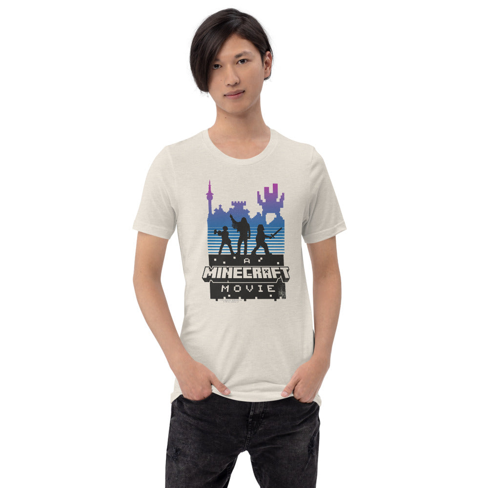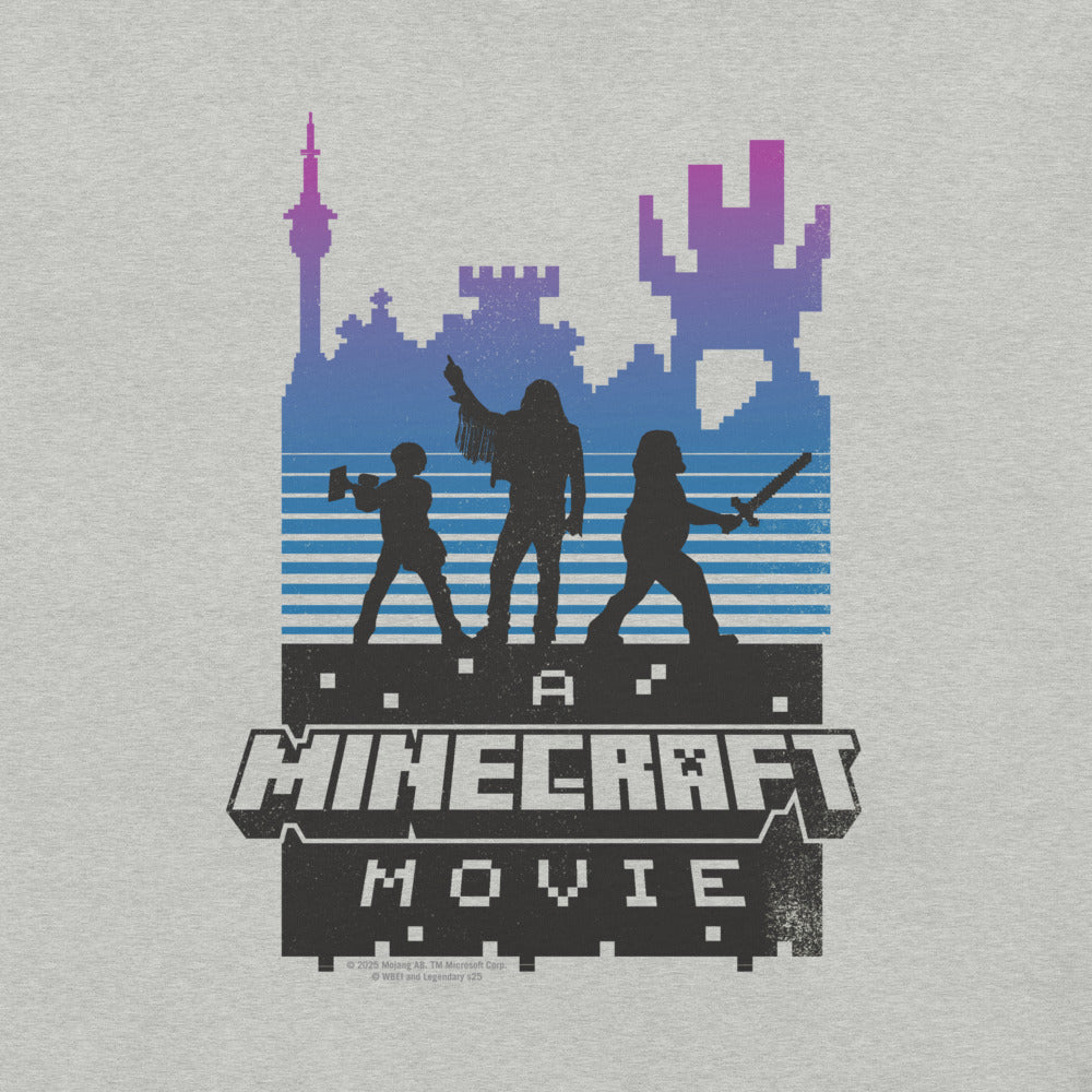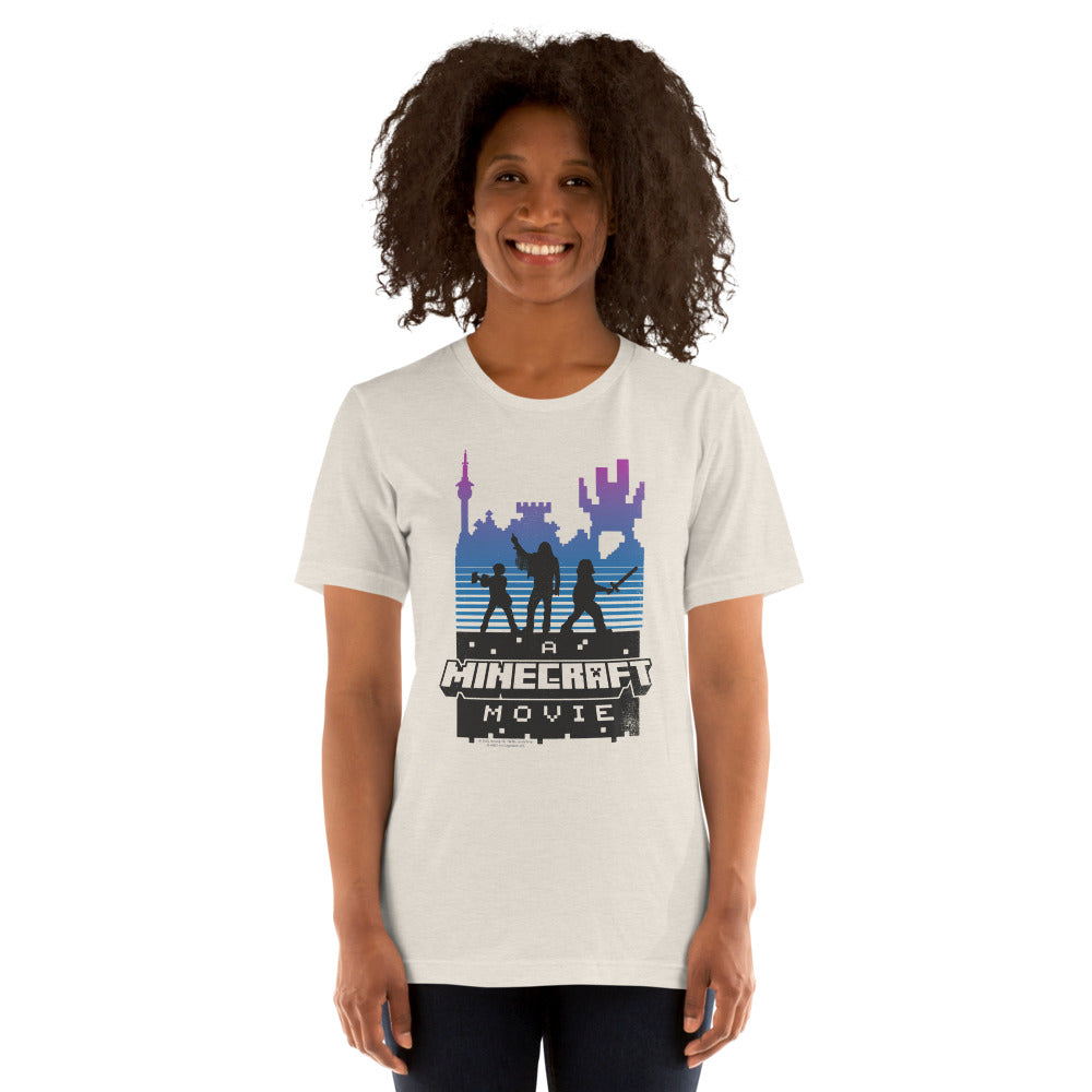 Level up your wardrobe with A Minecraft Movie Retro Silhouette Adult T-Shirt! Inspired by the highly anticipated A?Minecraft Movie, this tee features a bold retro-style silhouette design that brings the world of blocks and adventures to life.
