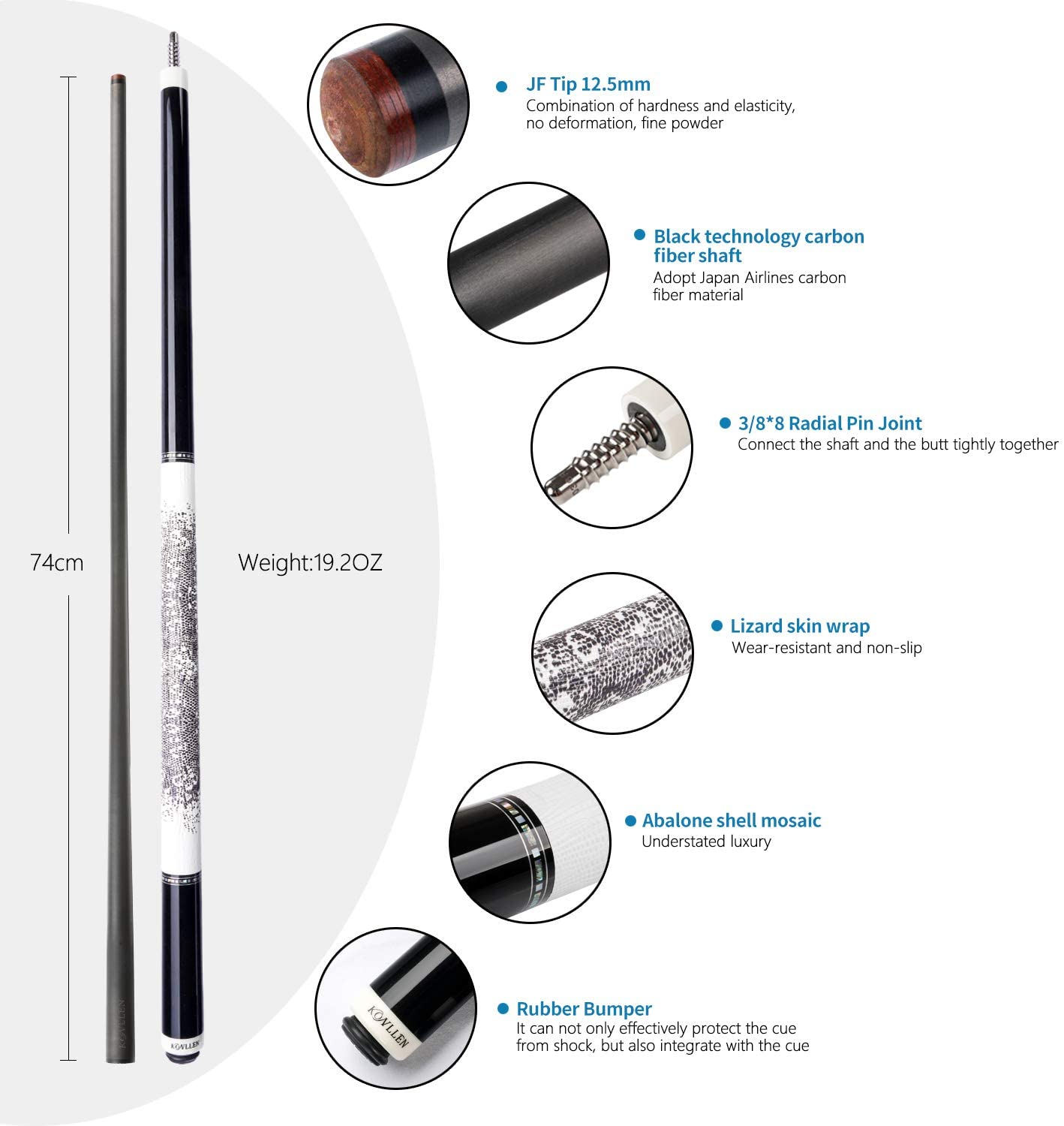 The 12.5mm carbon fiber shaft is durable and low deflection, suit for most professional players