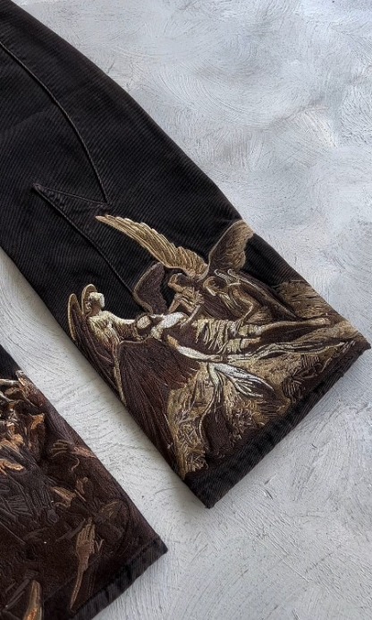 Cut in a deep brown denim with a soft thigh fade. Across the back legs, features a brown-toned 1,000,000+ stitch embroidery, inspired by The Lament of Icarus painting. Finished with custom panelling and a debossed leather tab featuring a golden-ratio 'Vescartes' logo.