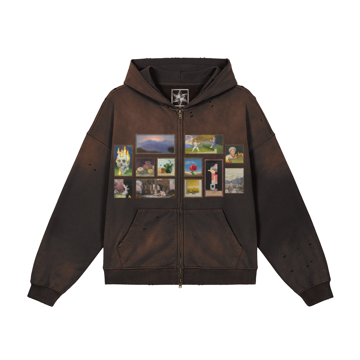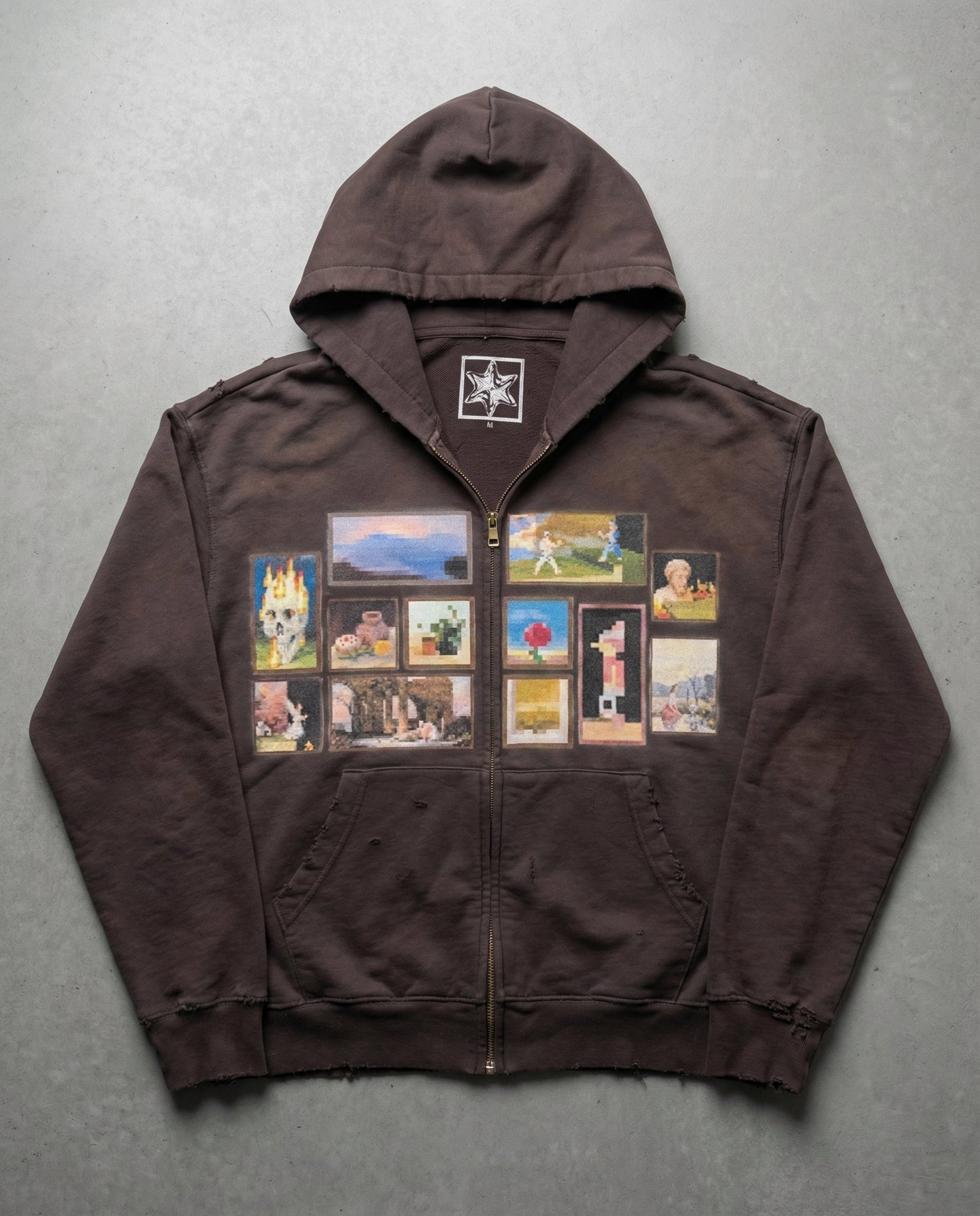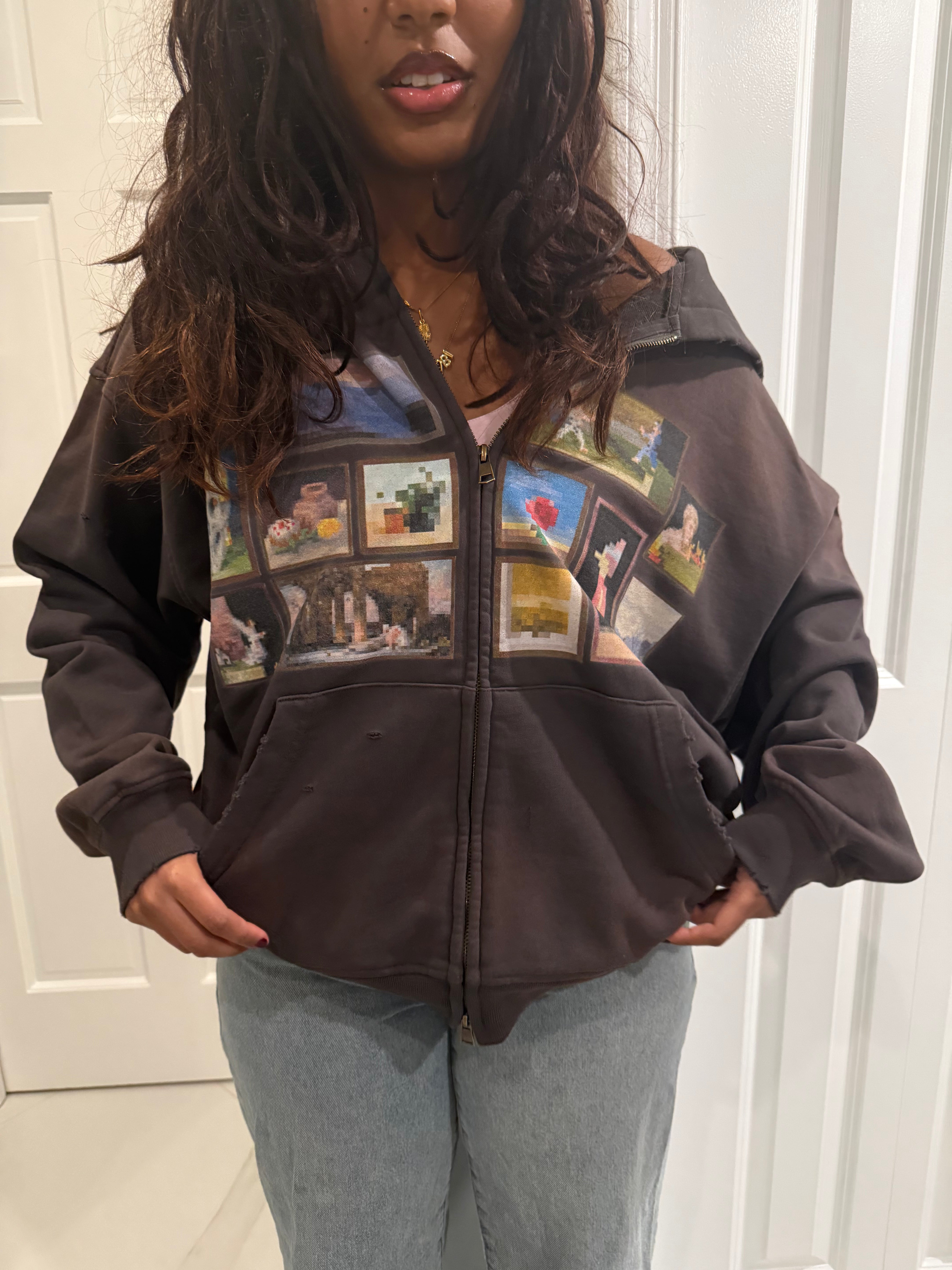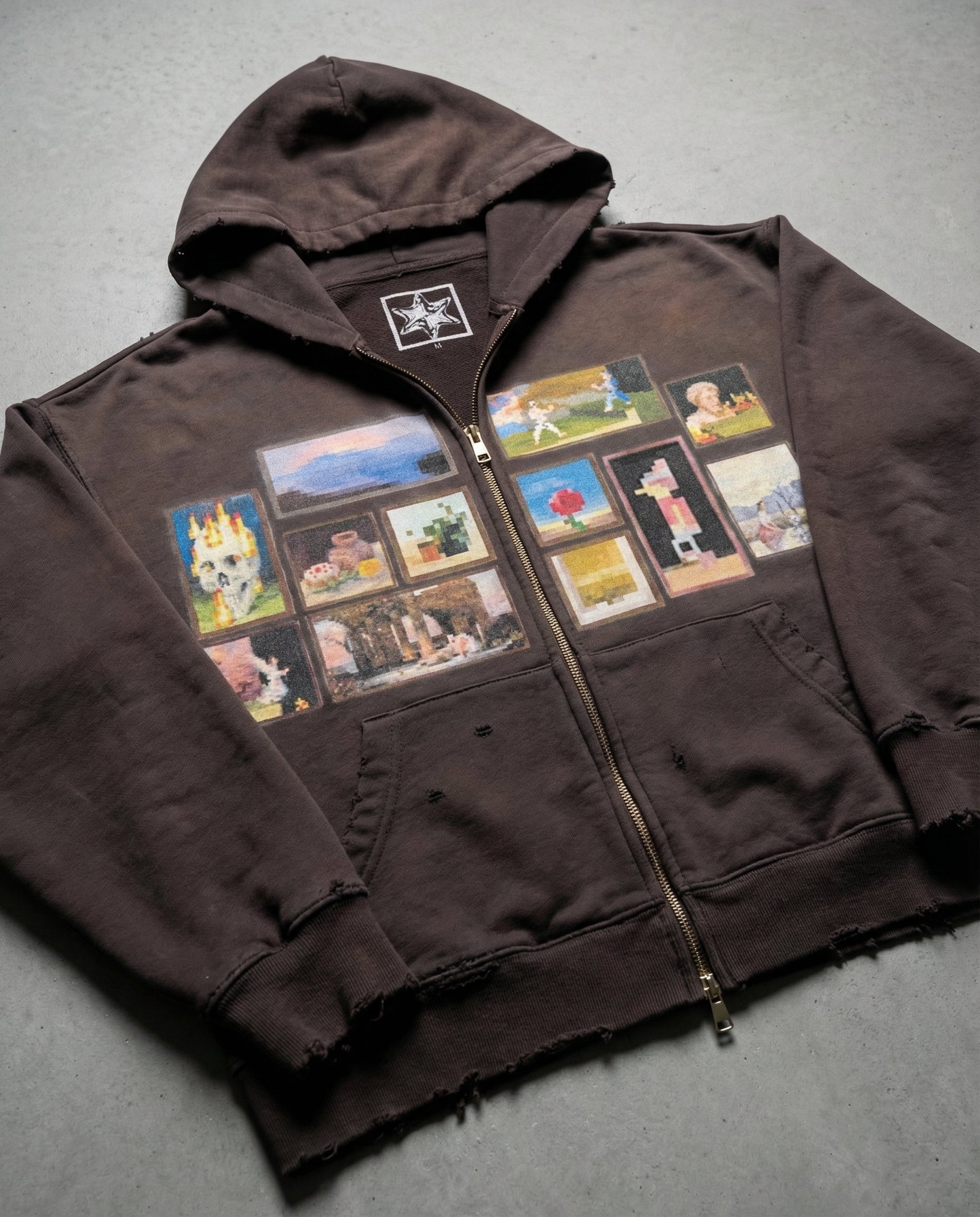 washed brown, distressed, full zip.