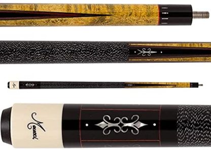 This Meucci pool cue with Black Dot Shaft emphasizes a consistent shot. The Birdseye Maple forearm is split by four black points with intricate pearl spear designs directed at your shot. The ebony butt sleeve has this same spear design enlarged and repeated within a pearl window border. This cue may be stylish, but it also has quality in its strike.The Black Dot Bulls-eye Shaft is the most consistent, hi tech, peak performing cue shaft that is flat-laminated from 35 Northern Hardrock Maple lamination's. Also, the unique joint and ferrule design allow for maximum performance with minimum effort. This is a great cue stick with a classy look.