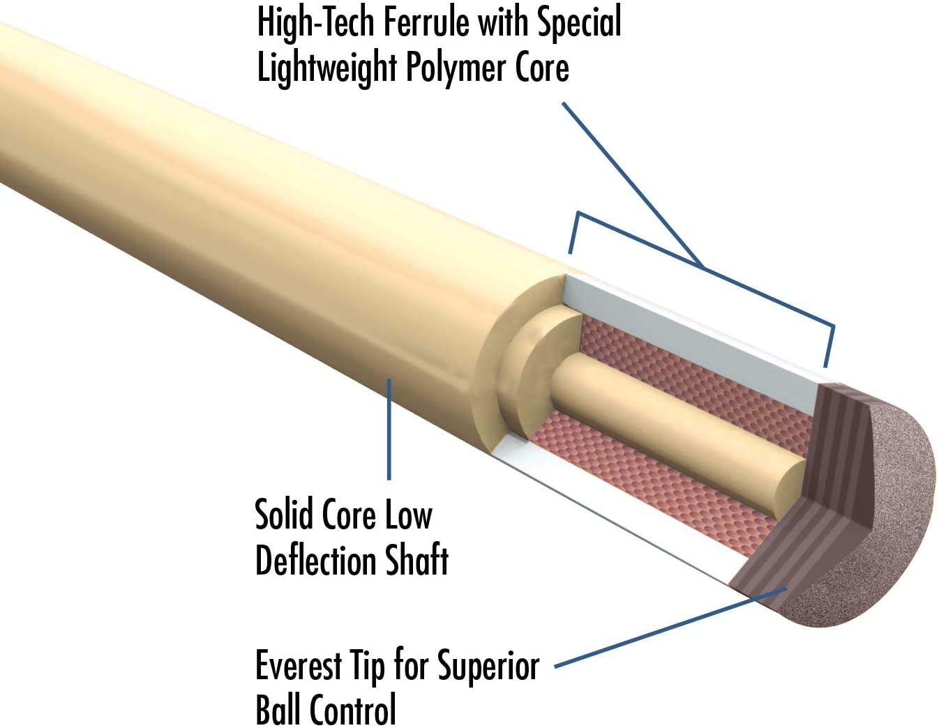 - 12. 75mm Lucasi Custom Solid Core Low Deflection Technology Shaft topped with an Everest tip by Tiger; This premium layered leather tip holds its shape like a hard tip, hits like a medium, and gives the ball control of a soft tip