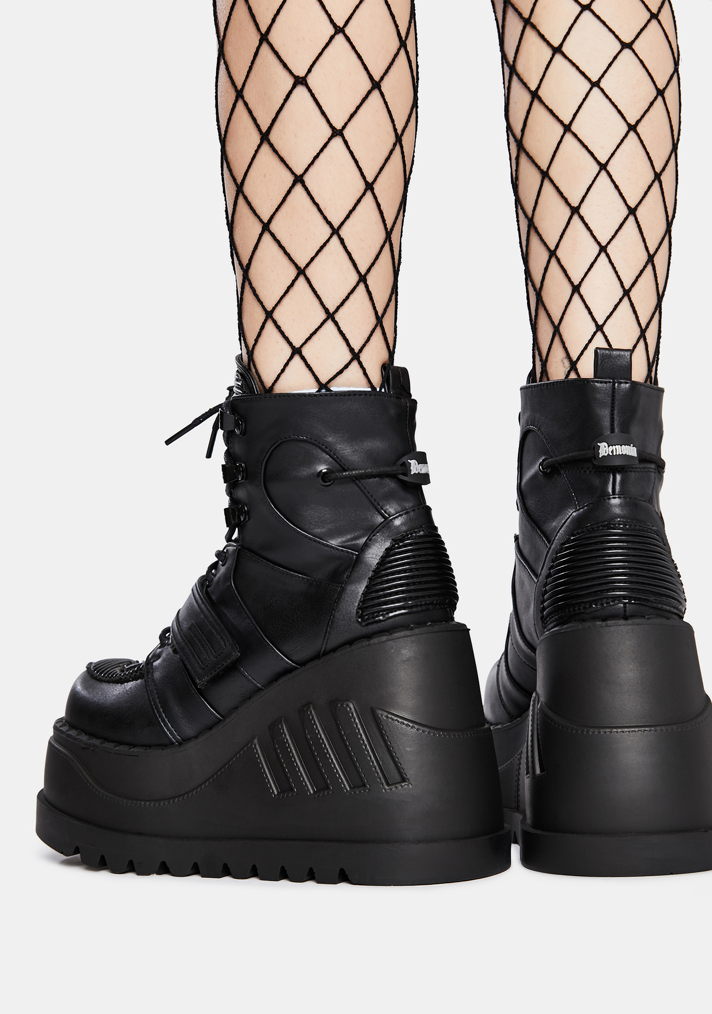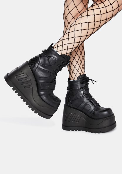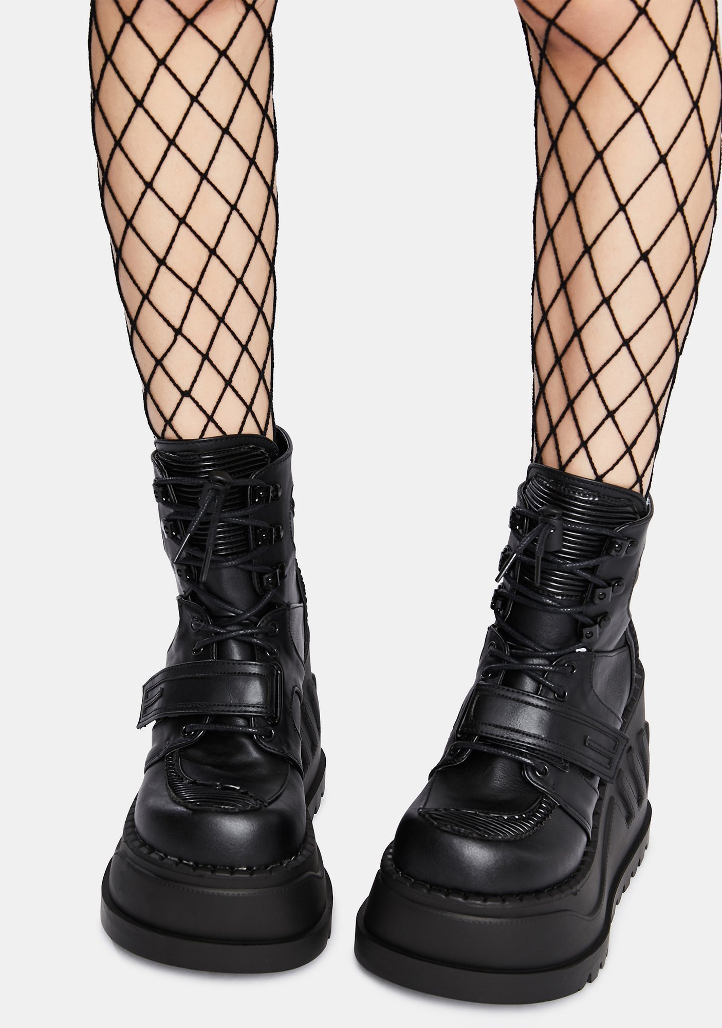 Void Stomper Platform Wedge Boots for embracing the darkness. These vegan leather ankle boots have chunky wedge platform soles, quilted detailing on the tongues, and lace up fronts with velcro straps.